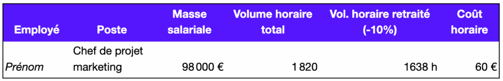 Pour estimer le taux horaire d’un salarié, prenez son salaire brut annuel, ainsi que toutes les charges salariales directes et indirectes (formation, avantages divers, etc.). Et divisez-le par le nombre d’heures travaillées à l’année. Attention, le taux d’occupation d’un salarié n’est jamais de 100%. Il y a des périodes de creux, des formations, des tâches non liées avec les missions clients, etc. Vous pouvez enlever 10% de son volume horaire annuel.