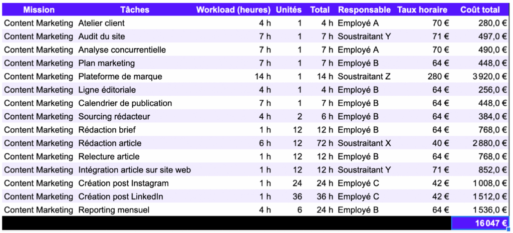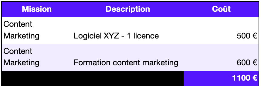 📌 Exemple : pour la mission de content marketing, l’agence doit acheter une licence de logiciel, et une formation que le client devra suivre.