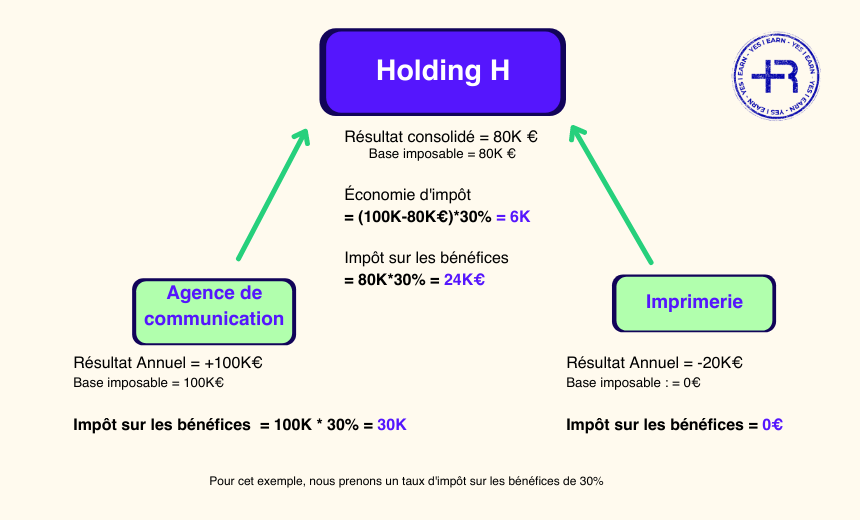 D’une manière très simplifiée, si la société A fait 100K€ de bénéfices et la société B 20K€ de perte, alors la holding H sera imposée sur 80K€. Le groupe réalise donc une économie d’impôt, car la base imposable de la société A était initialement de 100K€.