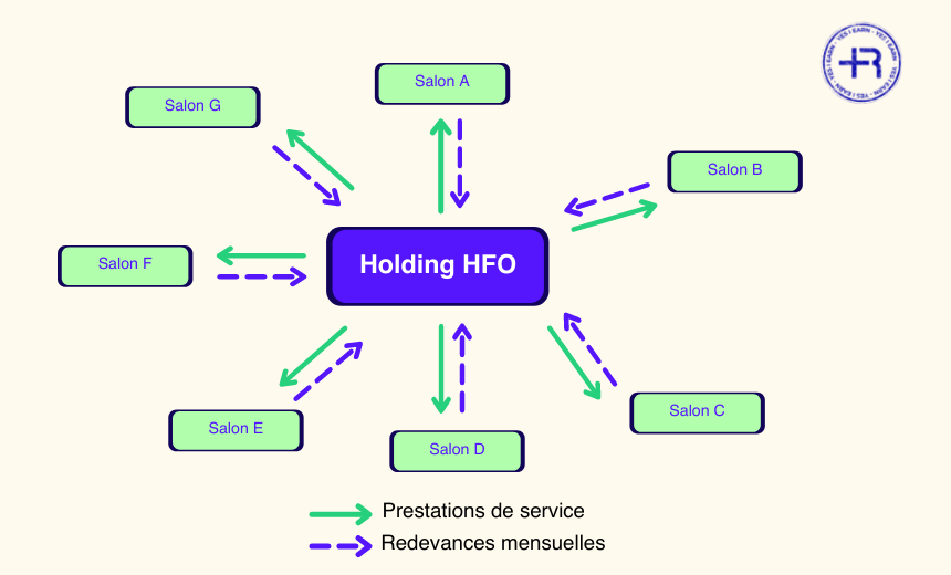 En contrepartie, les différents salons paient des redevances mensuelles à la “Holding HFO”. Les cadres peuvent se concentrer sur leur cœur de métier, en bénéficiant des services offerts par la société mère.
